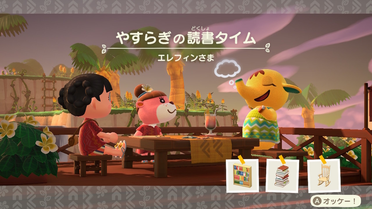 안녕하세요, 미쿠로입니다. 엄청 오랜만의 아츠 모리 플레이 일기입니다 (주민에 따르면 개월 만이었습니다 ). 상당히 늦어졌지만, 요전날 추가 컨텐츠 「해피 홈 파라다이스」 구입했습니다~! . 아프데도 확실히 놀 수 없었기 때문에, 그쪽과 병행해 쭉 진행하고 있습니다! 별장 소개( ) 그런데, 조속히 그 하피파라에 대해서입니다만, 내용으로서는 무인도 와는 또 다른 낙도에서 타쿠미 라이프라고 하는 별장 코디네이터점(?)의 도움을 한다고 하는 것! 이쪽이 타쿠미 라이프의 스탭 여러분(*^-^*)♪ 의뢰자의 별장을 에서 까지 코디하는 것으로, 본편과는 별도로 얽혀 하우징을 즐길 수 있다는 콘텐츠. 자신의 섬으로 가져갈 수 있는 가구나 기술도 해방되므로, 꽤 풍부한 내용이 되어 있습니다! 일의 흐름으로서는, 의뢰자로부터 이런 별장으로 하고 싶다고 상담을 받아, 이런 느낌으로 푹신한 이미지와 사용해 원하는 가구를 가르쳐 달라고 합니다. 후보지 중에서 장소를 선택하고, 나머지는 타쿠미 라이프가 준비한 가구를 사용해 코디해 갈 뿐! :엘레핀 「안녕의 독서 타임」 처음에는 사용할 수 있는 가구도 적지만, 수를 해 나가면 할 수 있는 일도 가구도 점점 늘어나갑니다! 필요한 가구만 배치하면 의뢰 달성이 되지만, 그 의뢰자나 테마에 맞추어 여러가지 만들어 가는 것이 즐겁다(*'▽') 언제 라도 리폼 가능하므로, 새로운 가구나 기술이 해방되면 돌아오고 괴롭히는 것도 좋고, 전부 제일부터 재작성하는 것도 좋다. 첫회만 엘레핀 고정인 것 같습니다만, 다음부터는 해변에 나타나는 도둑들(일환) 중에서 선택해 말을 걸어갑니다♪ 식초 "게임 사랑!" :마론 「멋진 동영상 촬영 스튜디오」 :사브리나 「역시 영화는 스크린으로!」 이 방은 진지하고 부럽다 ... (웃음) :브루스 「모두 보드 게임 !」 ---------------------------------- 우선 명의 의뢰를 달성한 곳까지 실었습니다만, 이런 느낌으로 일반적인 방이라기보다는 가게처럼 만들 수 있는 테마도 많아, 여러가지 생각하면서 만드는 것이 즐겁습니다. 아직 이 단계에서는 방의 넓이 등 만질 수 있는 부분이 적지만, 의뢰를 달성해 나가면 별장 이외의 시설 등도 해방되어 가기 때문에, 조금씩 놀 수 있는 폭이 퍼져 나가는 느낌이 또 재미있다. 자신의 섬의 거주자도 기념품 초콜릿을 건네주는 것으로 초대할 수 있는 것 같기 때문에, 마음에 드는 거주자는 데려올까라고 생각하고 있습니다(^ ^) 다음 번은 학교 만들기!재단사에서 귀여운 양복을 발견했기 때문에 입어 보았습니다! 이런 모습을 정말 좋아하고, 가을 같은 곳이 몹시 마음에 들고 있습니다(*´ω`*)♡ 작년의 겨울에 발견한 봉봉 첨부의 신발, 더 이상 귀여운 것이 발견되지 않기 때문에 올해도 계속 이것! 헤어스타일은 캣리누 씨에게 어레인지를 받은 새로운 헤어스타일입니다. l